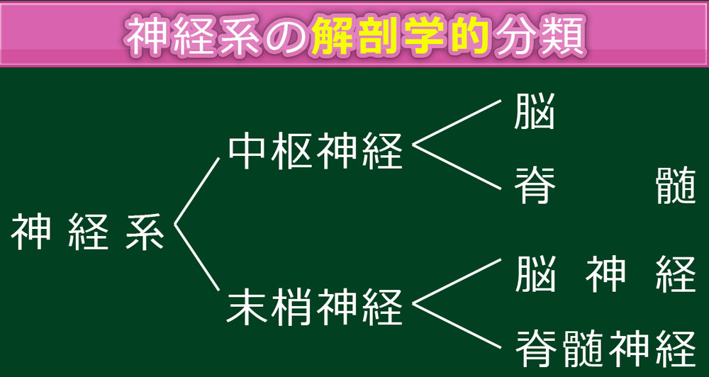 神経は、解剖学的に分類するとその機能の中心となる「中枢神経」と、そこから身体各部を連絡する「末梢神経」の2つにまず分けられます。